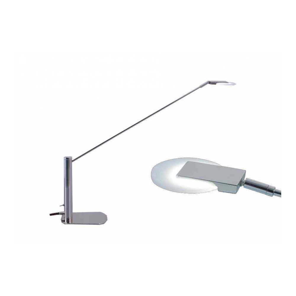 Descripción: Moderna lámpara de escritorio con Led de 6.8w, marca osram. Construída en metal y vidrio. Posee movimiento.