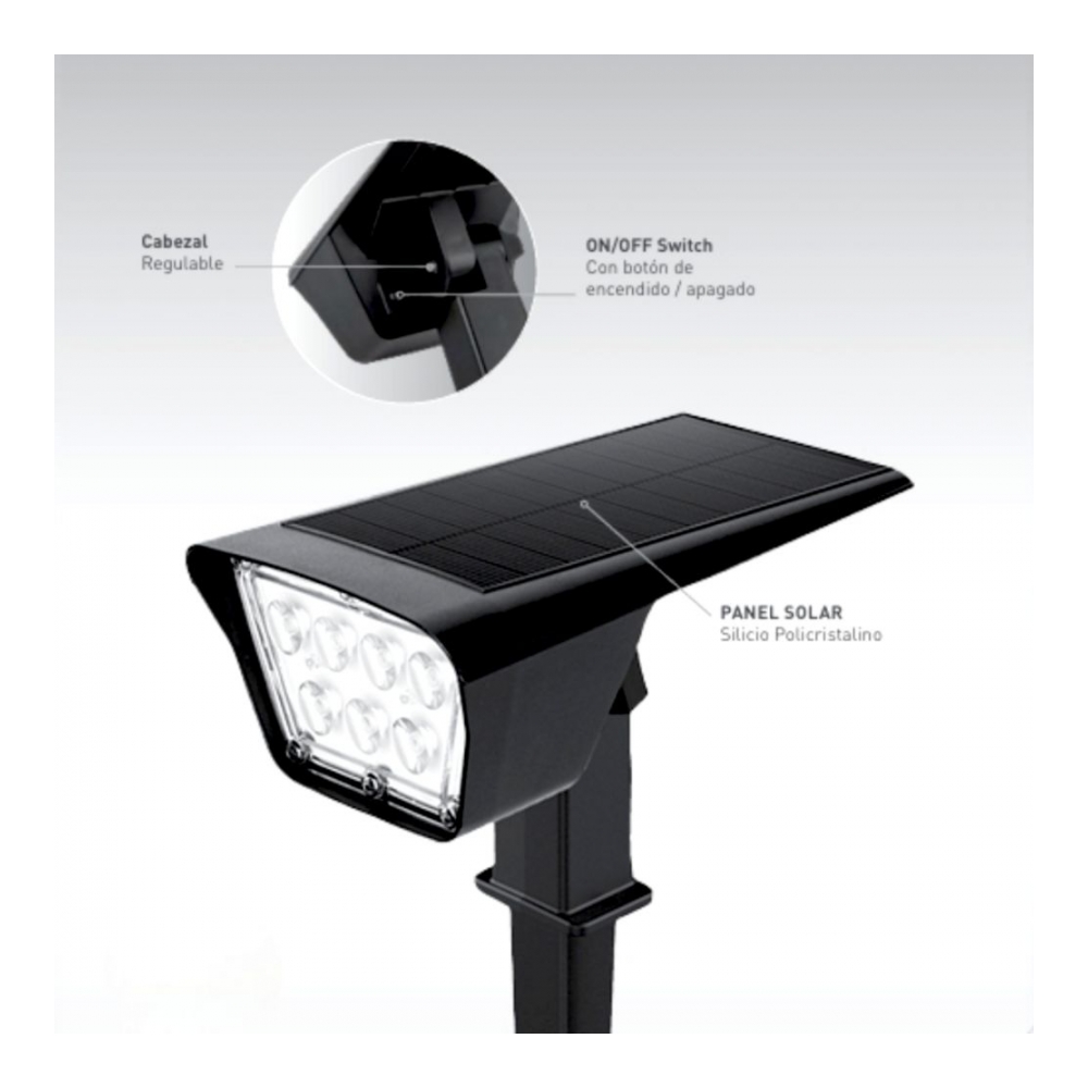 Descripción: Estaca LED solar de 2W, ideal para jardines, canteros y caminos. Funciona con fotocélula: se enciende automáticamente al anochecer. Ofrece una luz cálida 3000K, con cuerpo resistente apto para exterior (IP65) y una autonomía de hasta 6 horas según carga solar.