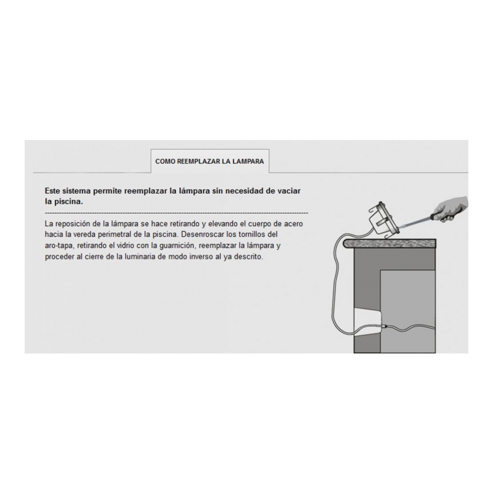 Descripción: Luminaria para piscinas, totalmente sumergible, segura y resistente, ideal para iluminación subacuática de alta calidad.