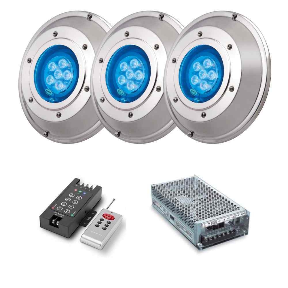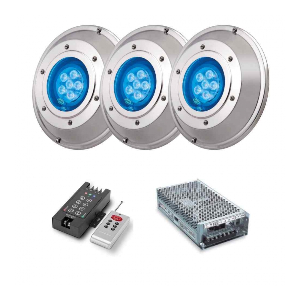 Descripción: kit Luminaria subacuática para piscinas y espejos de agua, con iluminación LED RGB de 18w alto brillo. Diseño seguro y duradero para instalación en pared.