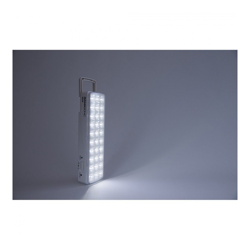 30 Leds. Uso portátil o para colgar. Manija retráctil. Pulsador de prueba. Encendido Inteligente. AUTONOMIA: Hasta 6 hs